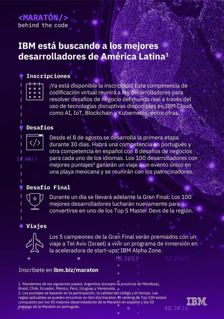 IBM está en busca de los mejores desarrolladores digitales de América Latina a través de la competencia de codificación “Maratón Behind the Code”, cuyo reto es resolver desafíos de negocio del mundo real a través del uso de tecnologías disruptivas como AI, IoT, Blockchain y Kubernetes, entre otras.