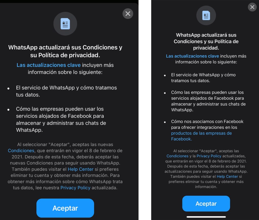 Los cambios en las políticas de WhatsApp han generado polémica en redes sociales después que la plataforma avisara a sus usuarios que sus nuevos términos de privacidad cambiarán y deberán ser aceptados por el usuario si es que desean continuar utilizando la aplicación, de lo contrario la aplicación no permitirá acceder a los chats y eliminará la cuenta.