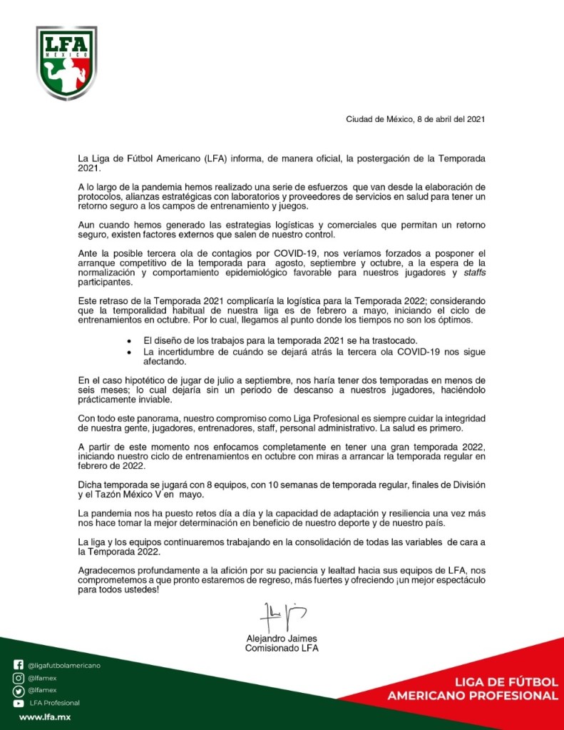 Esta mañana en conferencia de prensa vía Zoom, el comisionado de la LFA Alejandro Jaimes anunció que la Temporada 2021 de la Liga de Futbol Americano Profesional de México (LFA) no se llevará a cabo a raíz de la emergencia sanitaria por Covid-19.