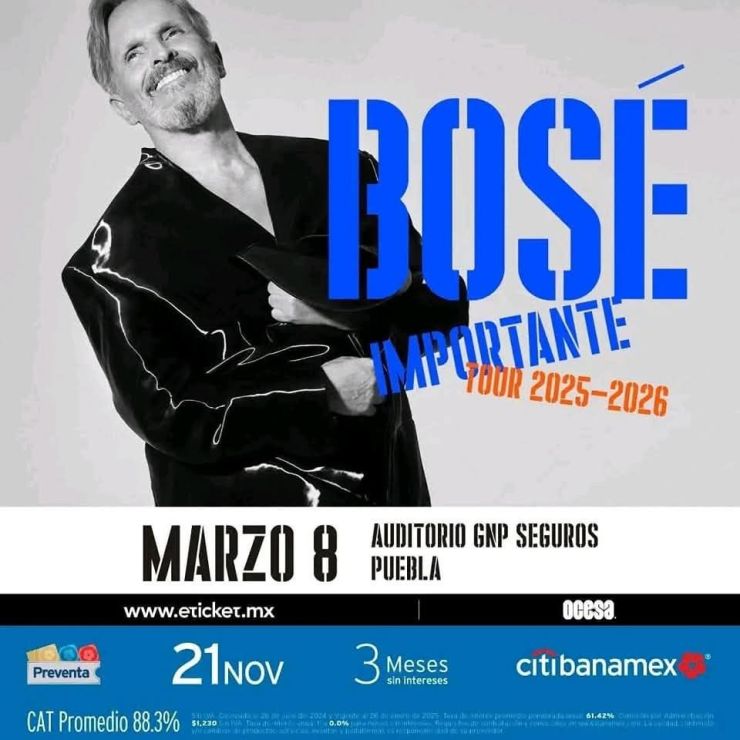 Recuerda que ya quedan pocos boletos para disfrutar del regreso de Miguel Bosé este 8 de marzo en Puebla y disfrutar de su Importante Tour 2025.